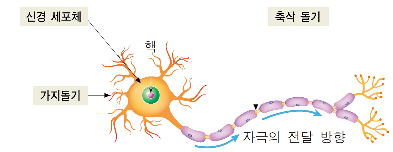 - 수상돌기 또는 가지돌기는 이전 뉴런과 연결되는 부분으로 신호를 받아들입니다. (컴퓨터의 신호)